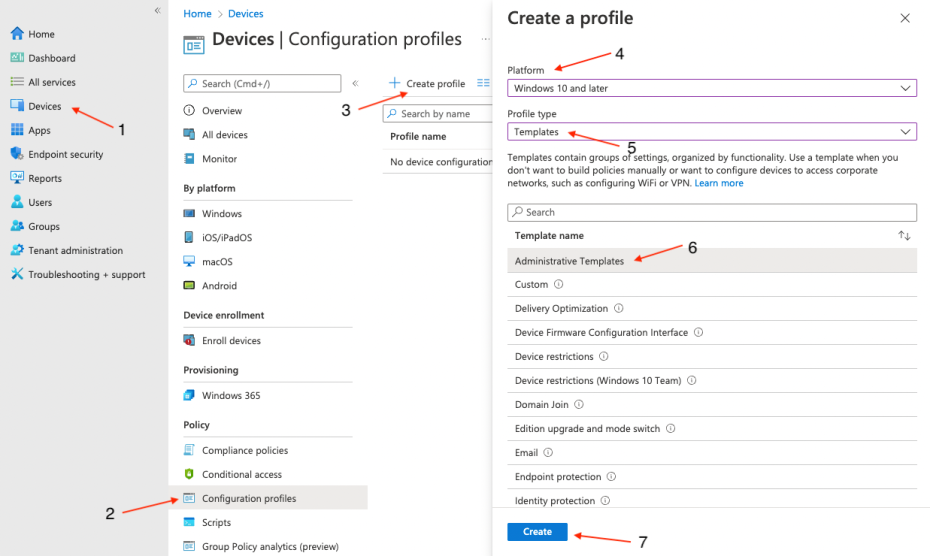 Select Windows 10 and later (4) as your target platform and Templates (5) as the Profile type. Then select Administrative Templates (6) then click the Create (7) button.