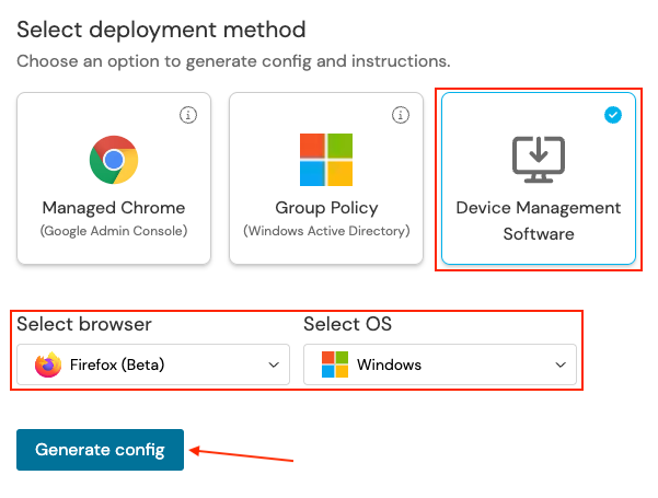 3. Select Device Management Software, choose Firefox as the browser, and Windows as the OS. Then click Generate config. This will allow you to download a config file specific to your team.