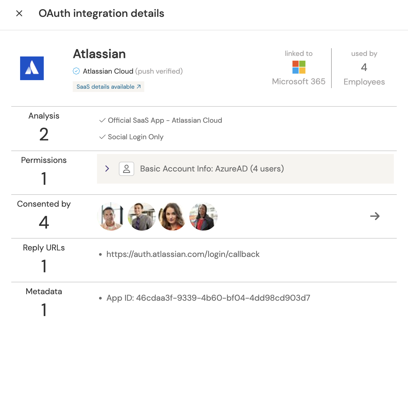 What permissions the application has, and for how many users. Click on a permission to view the exact scope that a user has delegated.