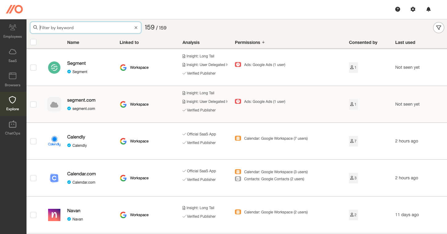 Third-party OAuth integrations connected to your synced identity provider or work platform, including dormant or risky integrations.